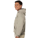 It includes a double-lined hood with a matching drawstring, a practical front pouch pocket, and rib knit cuffs and waistband with spandex for a snug fit.